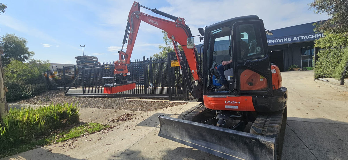 The Impact Road Broom designed for 4-5.5t excavators, sold by Impact Attachments, is an essential attachment for maintaining and cleaning roadways, construction sites, and industrial areas. Its primary applications include sweeping debris, dirt, gravel, and other materials from surfaces to ensure safety and cleanliness. The features of this Road Broom include adjustable sweeping widths, high-quality bristles for effective cleaning, and durable construction to withstand harsh working conditions. Its compatibility with small excavators allows for easy attachment and manoeuvrability, making it ideal for excavation projects, urban cleaning, and landscaping tasks. The compact size and efficient sweeping capabilities make it a versatile tool for maintaining clean and safe working environments in various terrain and operational conditions.